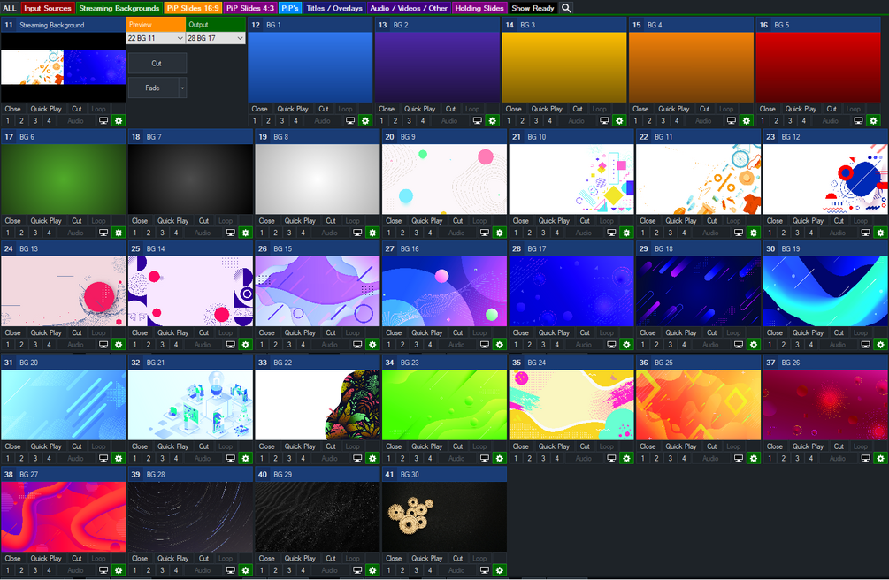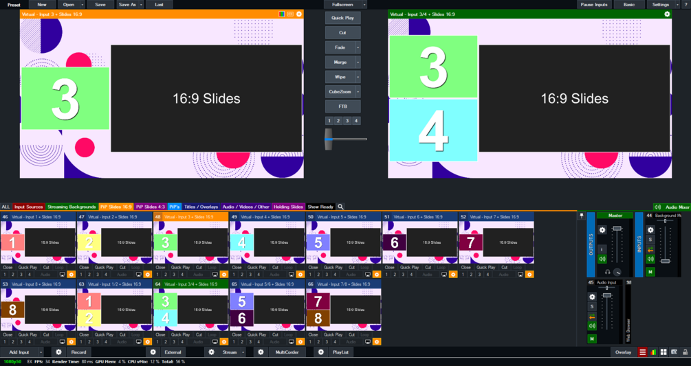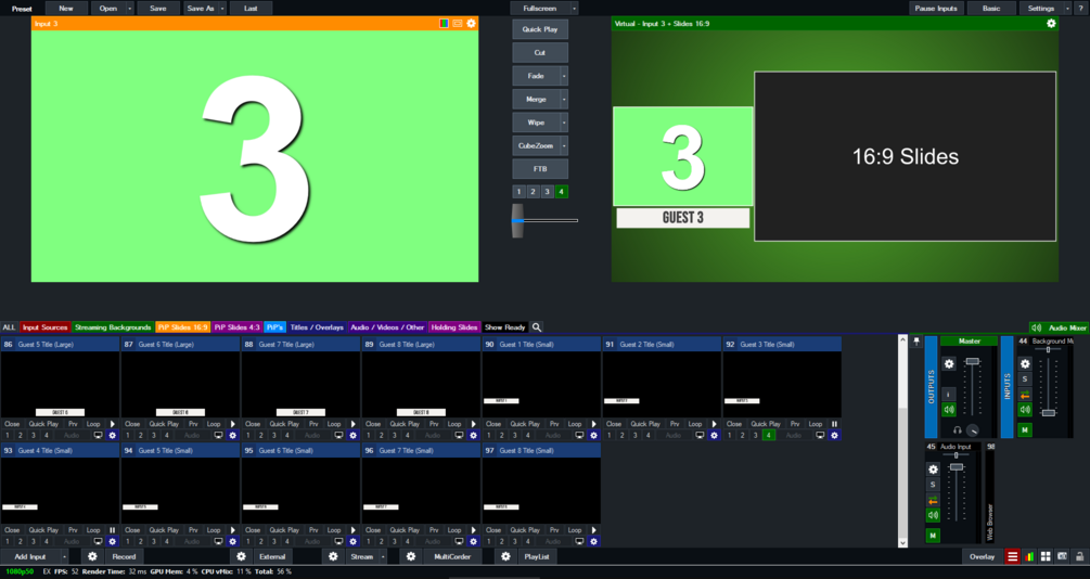 This template is suitable for a show that requires 8 or less input sources, plus either a 16:9 or 4:3 slideshow.